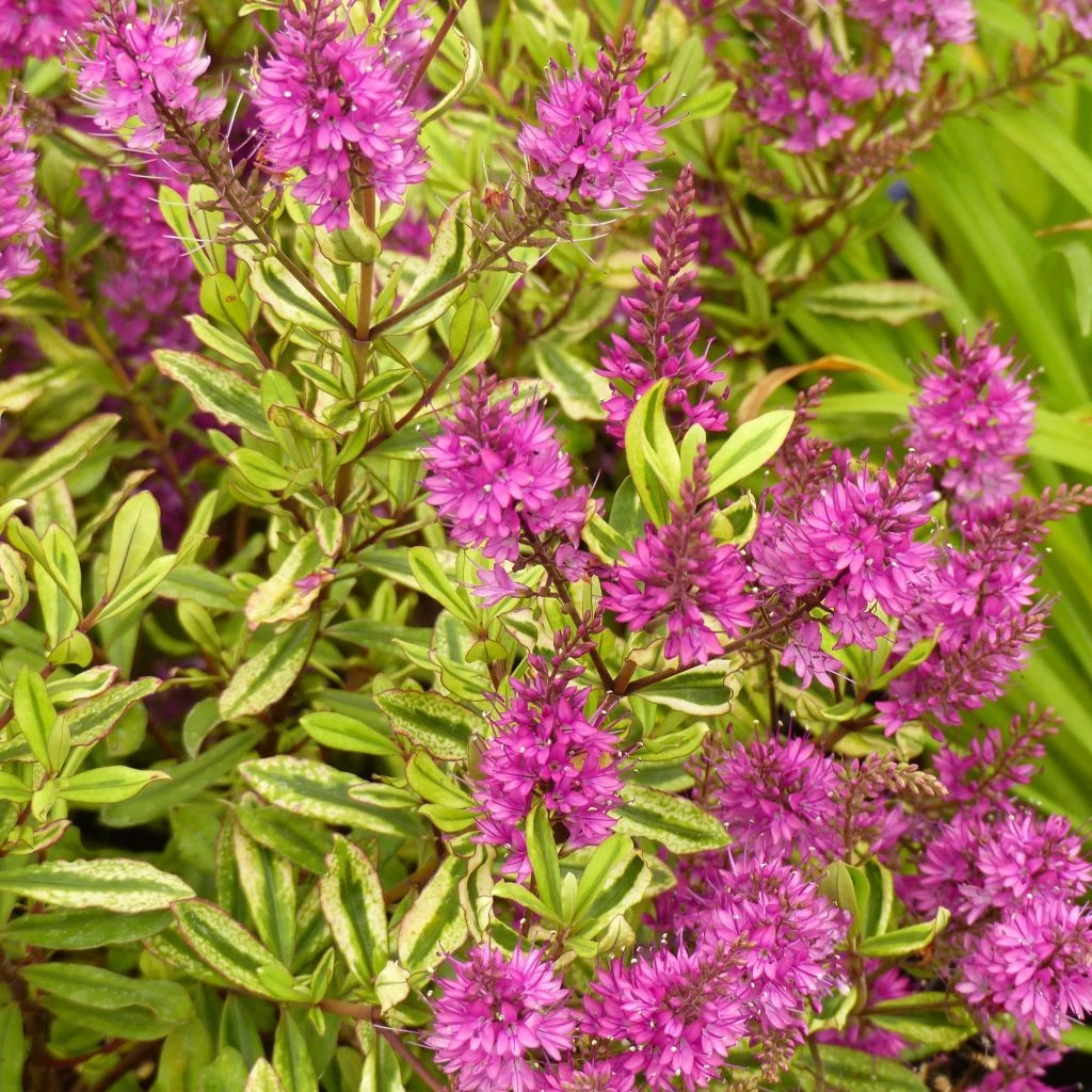 L’Hebe Celebration est une toute nouvelle variété hybride de Véronique arbustive directement issue de la belle ‘Wiri Charm’. Aussi facile à cultiver, aussi florifère et relativement rustique, elle se distingue par son beau feuillage panaché de crème et bordé de rose, ornemental toute l’année. Elle forme un opulent buisson harmonieusement formé qui charme aussi par sa longue floraison estivale, ses épis de fleurs d’un rose-violacé proche du magenta se renouvelant de juillet à septembre-octobre si le temps le permet. C’est une plante polyvalente que l’on pourra cultiver dans ne nombreuses régions aux hivers relativement cléments, en raison de sa bonne tolérance au calcaire et aux sols pauvres. Les Hebe sont traditionnellement d’excellentes plantes pour la terrasse ou les jardins de bord de mer, et celle-ci ne déroge pas à la règle.